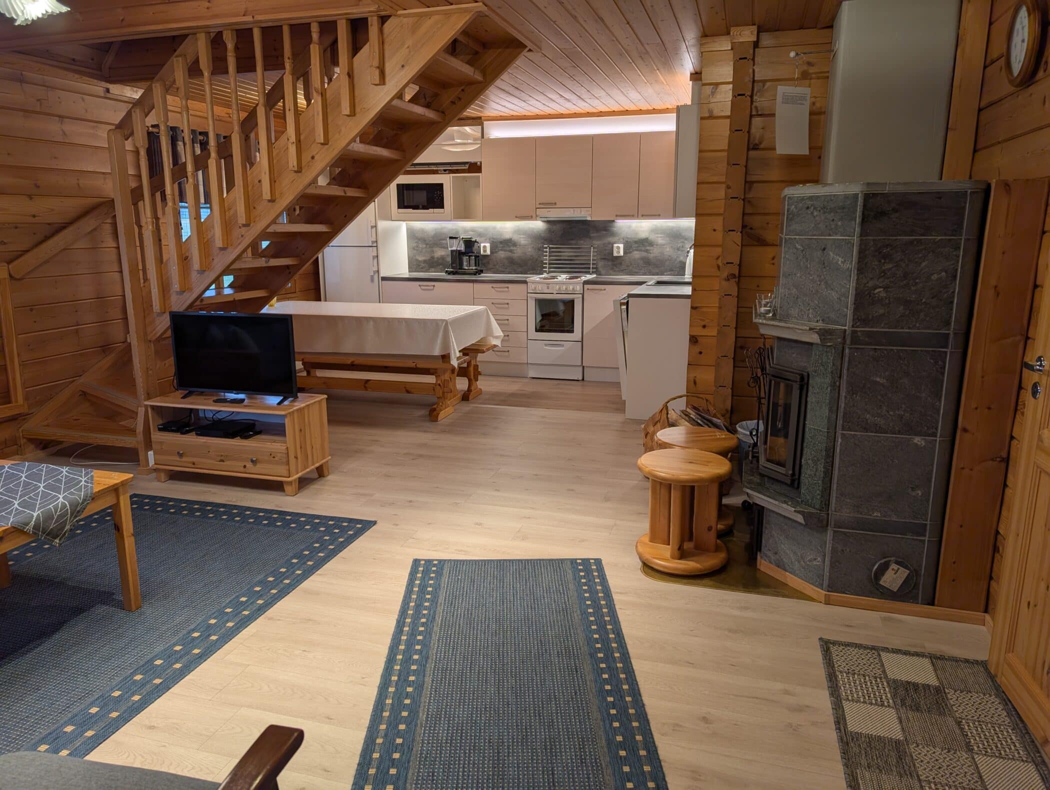 Sähkölämmitys, ilmalämpöpumppu, varaava takka, sähkövalaistus, tupakeittiö, sähköliesi, kahvinkeitin, jääkaappi/pakastin, mikroaaltouuni, astianpesukone, leivänpaahdin, vedenkeitin, vatkain, ulkovaatteiden kuivauskaappi, radio/cd soitin, Bluray, älytelevisio, silitysrauta, pyykinpesukone, ilmainen langaton internetyhteys.